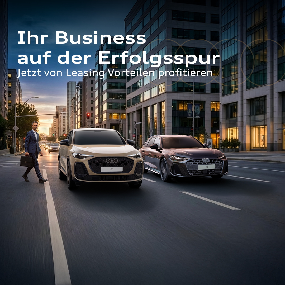 1) Laufzeit 48 Monate; Jährliche Fahrleistung 10.000 km; Ein Angebot der Audi Leasing für Businesskunden1, Zweigniederlassung der Volkswagen Leasing GmbH, Gifhorner Straße 57, 38112 Braunschweig. Zzgl. Überführungskosten und MwSt. Bonität vorausgesetzt. Gültig bis zum 31.03.2026. Verlängerung vorbehalten. Aktion nur gültig bei Zulassung bis 31.12.2026. Nur bei teilnehmenden Audi Partnern. Etwaige Rabatte bzw. Prämien sind im Angebot bereits berücksichtigt. Abgebildete Sonderausstattungen sind im Angebot nicht unbedingt berücksichtigt. Alle Angaben basieren auf den Merkmalen des deutschen Marktes.